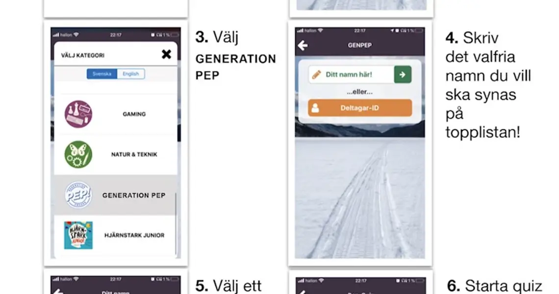 Ladda ned Active Quiz appen och i sökfältet sök GENPEPBARN eller GENPEPVUXNA för att få upp Generation Peps quiz.
