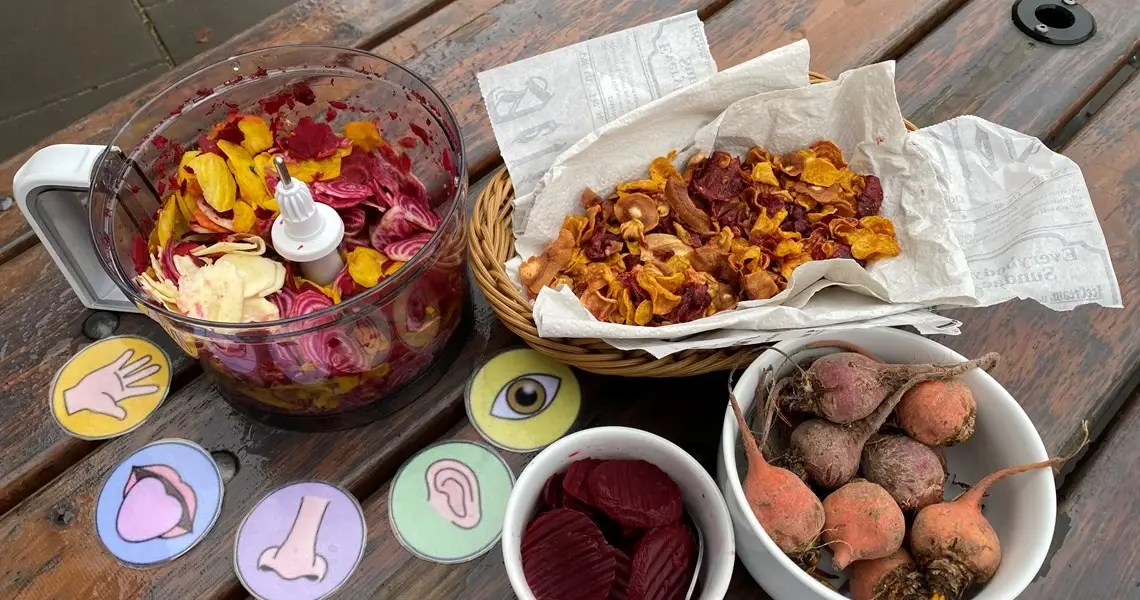 På Förskolan Himlabacken i Klippan arbetar vi med Måltidspedagogik och månadens råvara. Vi tänker utifrån säsong och använder de råvaror som är aktuella. En gång i veckan får barnen undervisning där vår Måltidspeppare tar fram råvaran. De får uppleva och smaka på den i olika former, såsom kokt, stekt, friterad som juice eller på ett annat vis. Barnen får använda alla sin fem sinnen enligt sapéremetoden. De fem sinnena är lukt, smak, känsel, hörsel och syn. Råvarorna används även i annan sorts undervisning. När vi haft råvaran rödbeta har barnen fått göra tryck och måla med den. När vi haft potatis har vi planterat potatis, gjort egna chips och potatistryck. Månaden när vi hade pumpa har de fått göra en pumpalykta. När vi hade äpple gjorde barnen äppeltryck. Hela tiden involveras månadens råvara i undervisningen. Vårt kök gör sallader eller annat och smyger in råvaran vid måltiderna också för att skapa den röda tråden och de ger oss ett samtalsämne vid matbordet.
