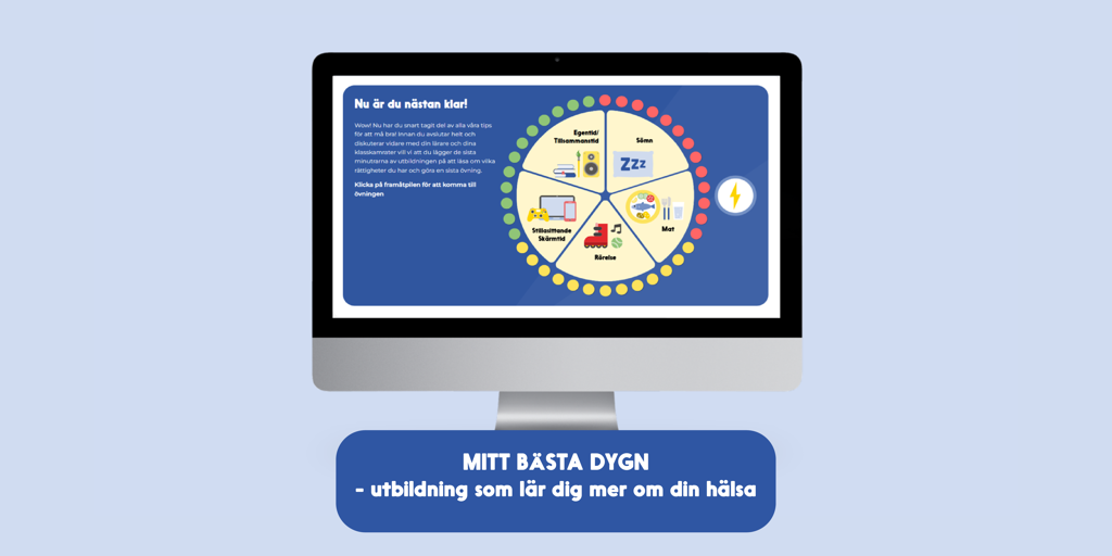 Webbutbildningen Mitt bästa dygn- utbildning som lär dig mer om din hälsa riktar sig till elever i mellanstadiet och högstadiet med syftet att öka kunskapen om vad de behöver för att må bra. Utbildningen som är tänkt att genomföras på skoltid tar upp ämnena sömn, rörelse, mat, stillasittande skärmtid och egentid/tillsammanstid. Till webbutbildningen finns också en lärarhandledning som gör att du som lärare kan fördjupa elevernas kunskaper och koppla undervisningen till det centrala innehållet i kursplanerna. Mitt bästa dygn kan också med fördel användas av elevhälsan och fritidspersonal. Den här utbildningen finns i två versioner. En riktar sig till elever i mellanstadiet och den andra till elever i högstadiet.